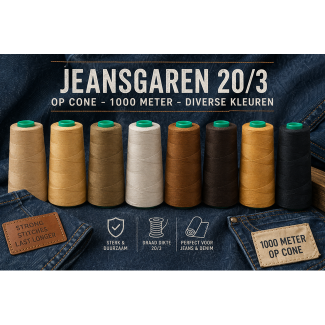 Stark, langlebig und perfekt für robuste Nähte! Dieses Jeansgarn 20/3 auf Konus von 1000 Metern ist speziell zum Nähen von Jeans, Denim, Canvas und anderen festen Stoffen geeignet. Dank der robusten Fadenstruktur ist dieses Garn ideal für sichtbare Zierstiche, Steppnähte und extra starke Nähte.