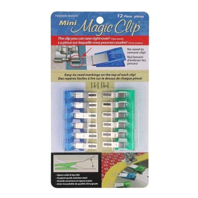 Die Magic Clips von Taylor Seville funktionieren wie eine Klammer: Sie haben einen Kunststoffgriff, an dem zwei Edelstahlplatten befestigt sind. Die Platten greifen ineinander und öffnen sich, wenn Sie den Griff zusammendrücken. Damit mögen sie vielleicht wie Standard-Stoffklammern aussehen, aber die Magic Clips haben ein einzigartiges Design, das es ihnen ermöglicht, einfach unter den Nähfuß der Nähmaschine zu passen. Die Magic Clips müssen während des Nähens nicht entfernt werden, was Zeit spart und zudem die Qualität Ihrer Näh- oder Quiltarbeit verbessert, da die Stofflagen nicht verrutschen können. Der minimale Abstand, der zwischen dem Ende des Magic Clips und der Nähmaschinennadel eingehalten werden muss, beträgt 3,2 mm (oder 1/8 Zoll). Diese Mini Magic Clips sind 3,8 cm lang. Auf der oberen Platte ist eine Maßeinheit in Zoll angebracht. Dies ist eine Maßeinheit, die beim Quilten als Standard-Nahtzugabe verwendet wird: 1/4 Zoll. Dies entspricht 0,635 cm. So können Sie Ihre Nahtzugabe beim Nähen einfach bestimmen und einhalten. Die Mini Magic Clips sind pro Packung erhältlich: