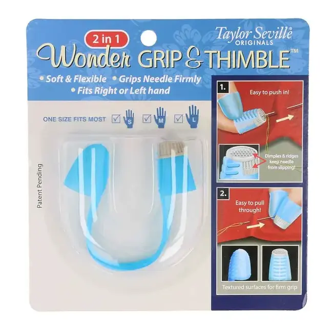 Der Wunder-Fingerhut mit Schutz von Taylor Seville ist ein praktischer Helfer, der Ihre Finger beim Nähen schützt. Zudem erleichtert er das Nähen von Hand erheblich. Der Wunder-Fingerhut besteht aus zwei miteinander verbundenen Teilen. Ein Teil ist ein normaler Fingerhut aus flexiblem Silikonmaterial mit einer harten Kunststoffspitze, was ideal ist, um Druck auf die Nadel auszuüben, ohne dass diese abrutscht oder durch den Fingerhut stechen kann. Der andere Teil ist ein flexibler Fingerhut, den Sie über Ihren Daumen legen können. Dieser Teil hat eine Oberfläche mit Relief, die für zusätzlichen Halt an der Nadel sorgt, wenn Sie diese durch den Stoff ziehen möchten. Das Material gewährleistet eine gute und bequeme Passform. Der Fingerhut ist blau und hat eine graue Spitze. Geeignet für Rechts- und Linkshänder.