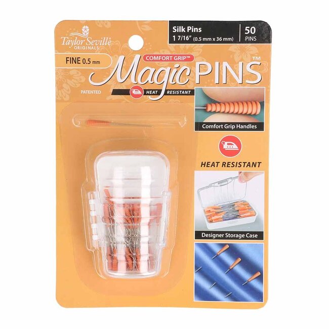 Die Magic Seidennadeln von Taylor Seville eignen sich für alle Arten von Quilt- und Näharbeiten mit empfindlichen Stoffen, wie Seide. Sie sind rasiermesserscharf und gleiten leicht durch den Stoff, ohne Löcher zu hinterlassen. Die Nadeln sind aus Metall gefertigt und haben einen hitzebeständigen Kunststoffgriff. Sie können also einfach über die Nadeln bügeln. Dank der Rillen am Griff haben Sie außerdem einen guten Halt. Durch die orange Farbe des Griffs sind die Nadeln in Ihrer Arbeit leicht wiederzufinden. Die Nadeln von Taylor Seville werden in einer praktischen Aufbewahrungsbox mit einem Klappdeckel aus transparentem Kunststoff geliefert. Die Magic Seidennadeln sind 36 mm lang und in zwei verschiedenen Stärken erhältlich: extra fein (0,4 mm) und fein (0,5 mm). Geliefert pro 1 Packung mit 50 Nadeln.